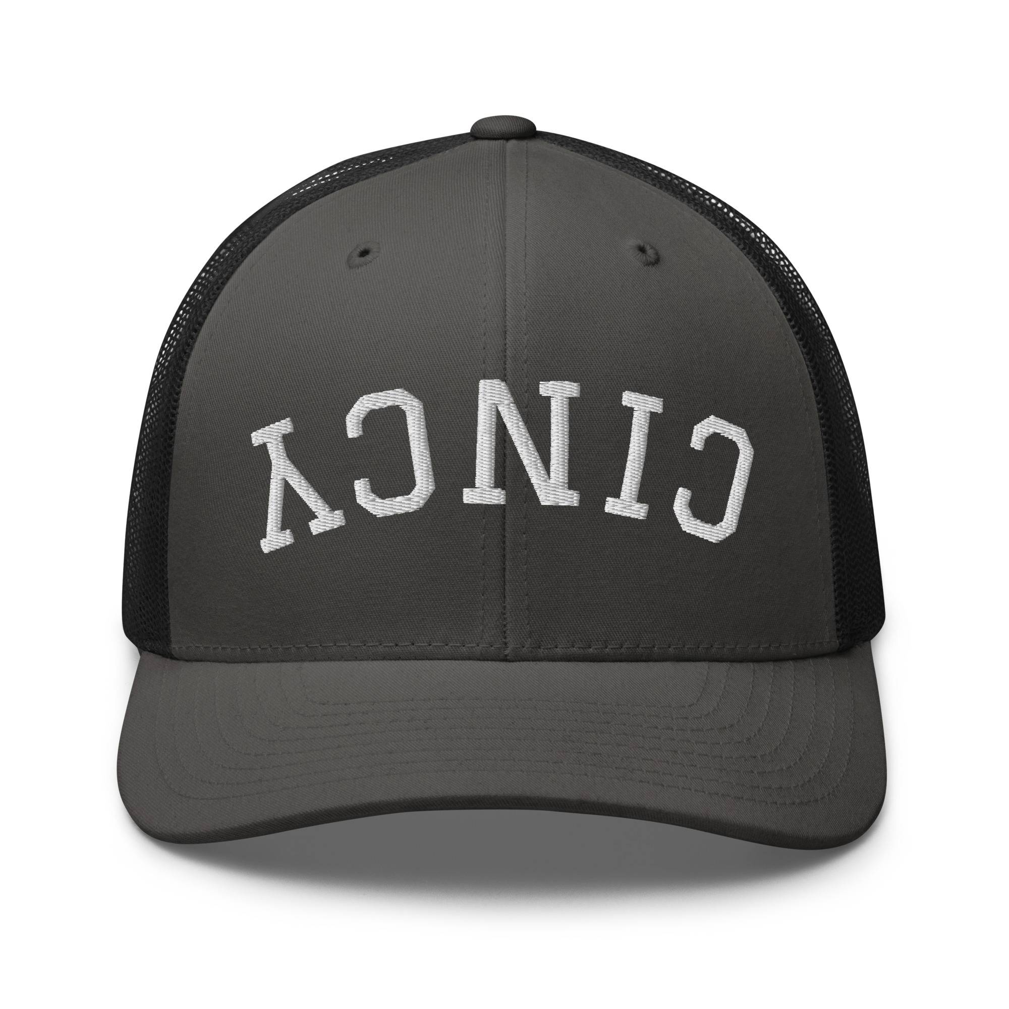 Add this standout upside down Cincy trucker hat to your collection today.