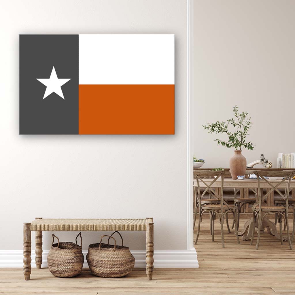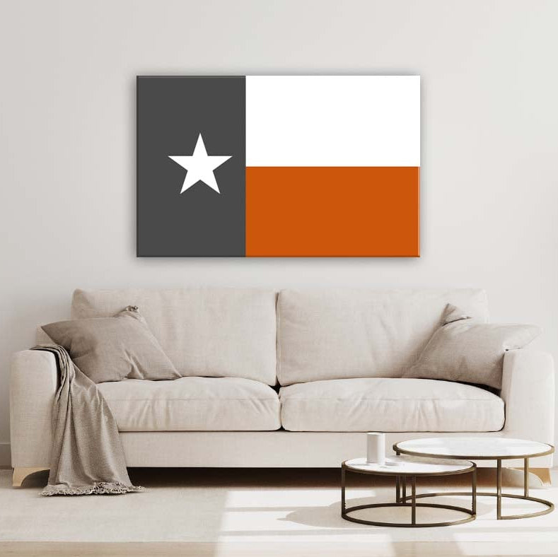 Show your Texas pride with this Burnt Orange and Gray Texas Flag Canvas Wall Art Print. Featuring a bold twist on the traditional Texas flag, this design incorporates burnt orange and gray tones, making it a standout piece for Texans and anyone who loves unique patriotic décor.